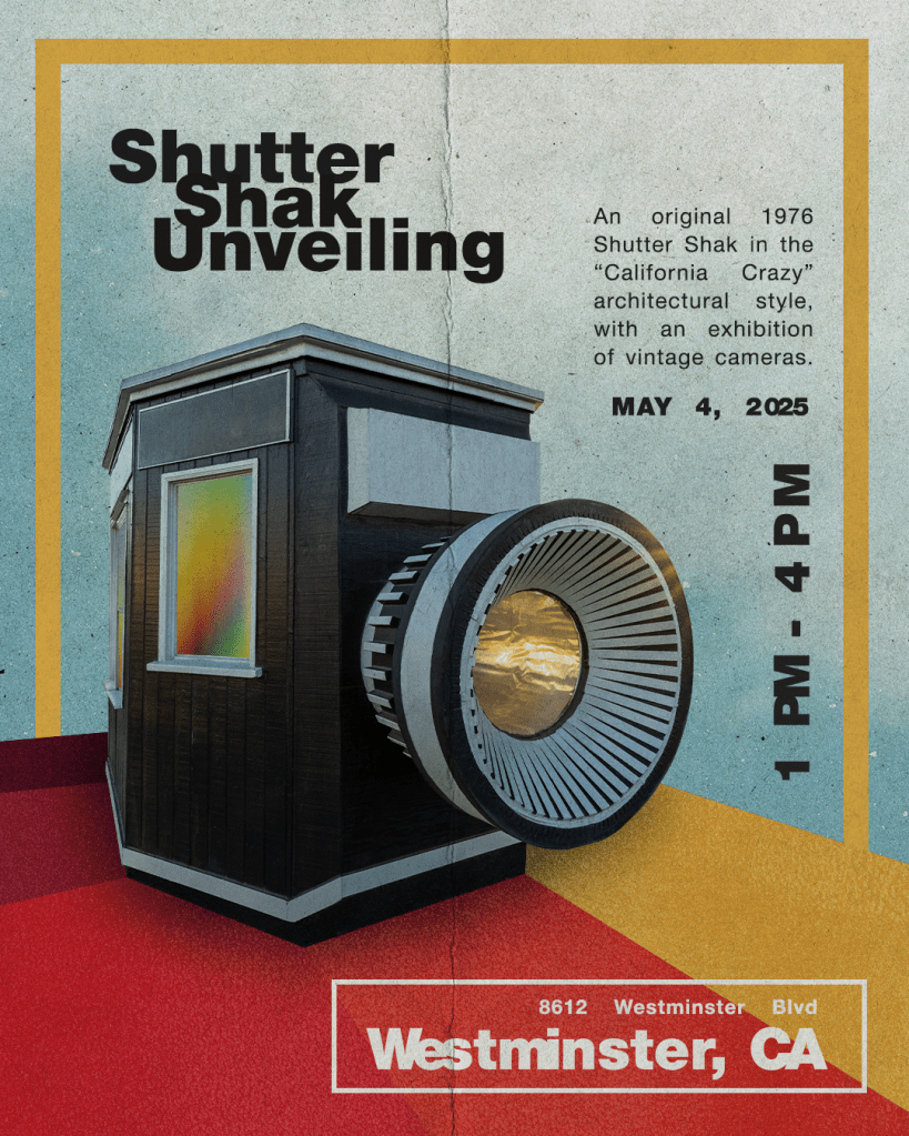 Join us for the unveiling of an original 1976 Shutter Shak, a stunning example of “California Crazy” roadside architecture. This unique structure, once a beloved photo film developing hub, will be on display alongside an exhibition of vintage cameras, celebrating the artistry and history of photography.