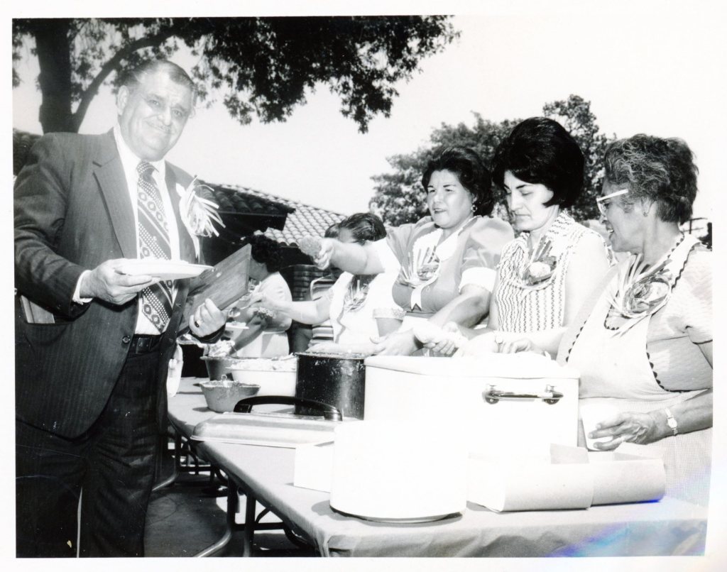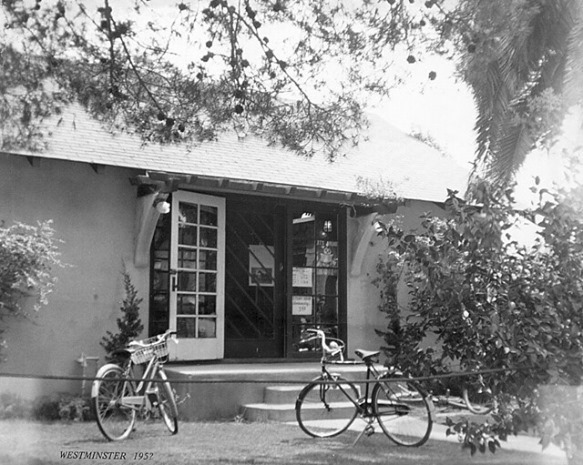 For years, the site remained Westminster’s central plaza—a kind of “no man’s land.” Yet it was still the heart of the community, home to the first school and surrounded by early churches. In the late 1920s, a branch of the Orange County Public Library was built on the property, and during the Depression and after World War II it became a lively gathering spot, hosting Boy Scout meetings, community worship services, and countless baseball games, including a thriving Mexican American league in the 1930s and 40s.Councilman Eldon Gillespie and guestsLibrary, most likely circa late 1940s